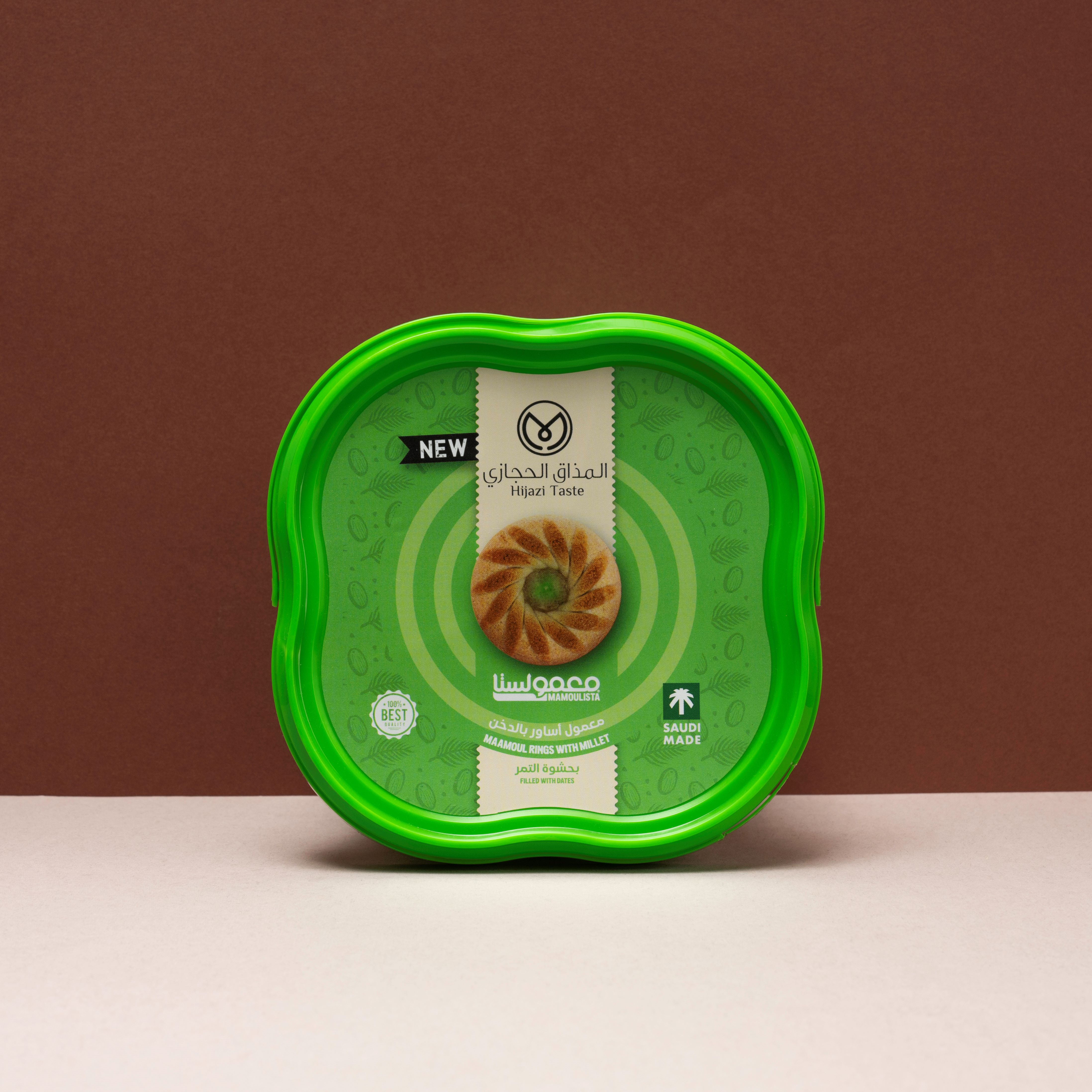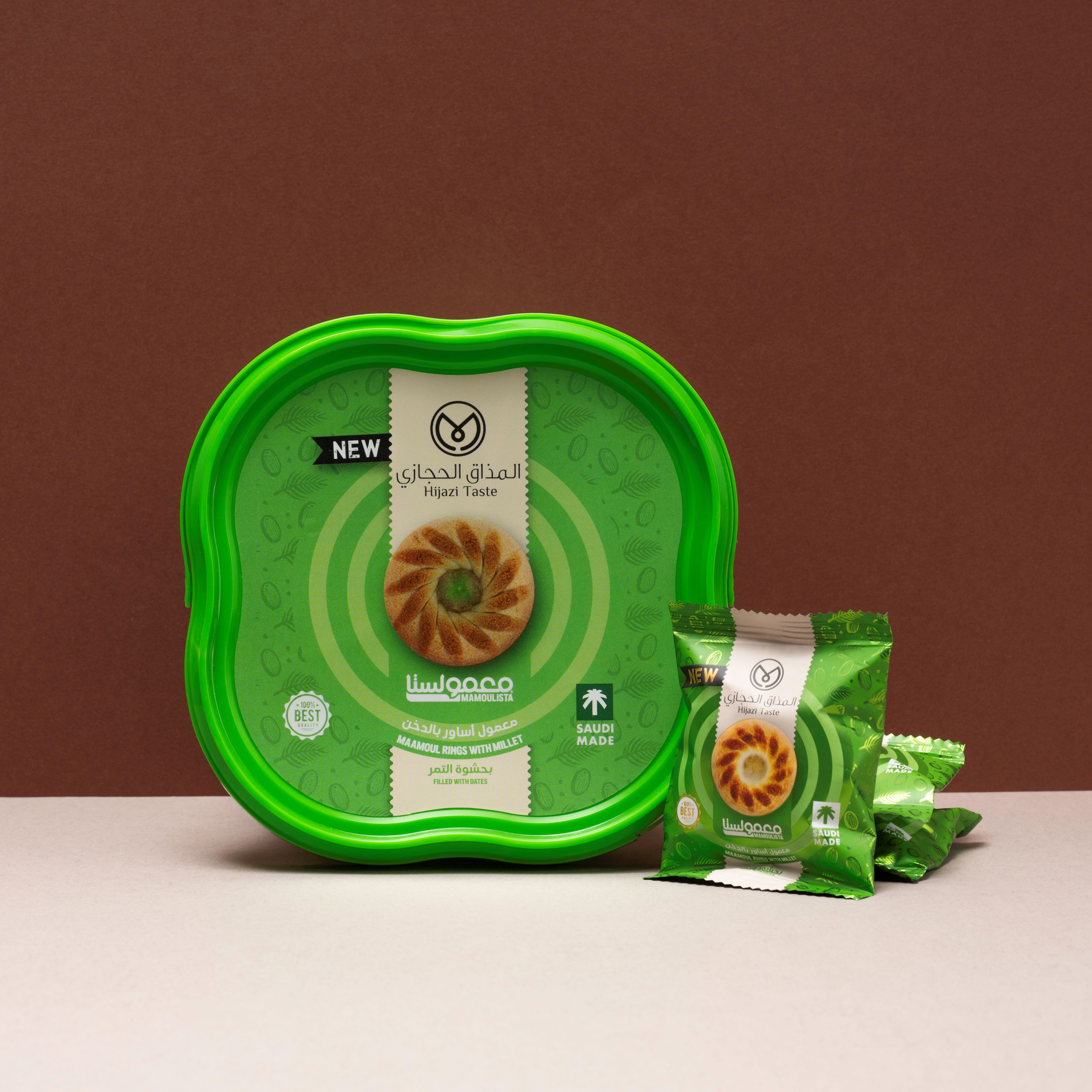 بدقيق الدخن الفاخر محشو بالتمر السعودي. مقدم لكم بتغليف عصري و مناسب ،أساور معمولستا من المذاق الحجازي لأهل المذاق.