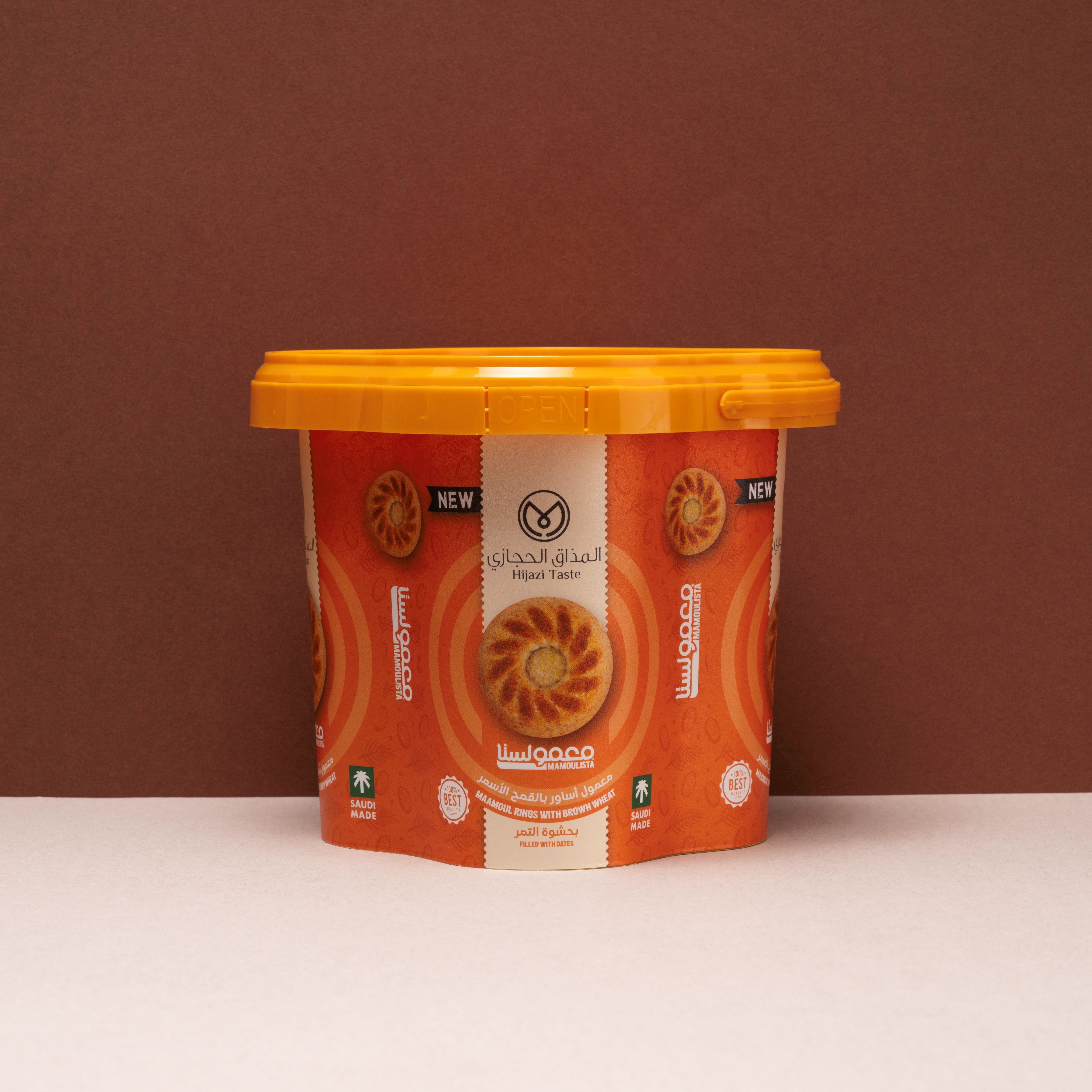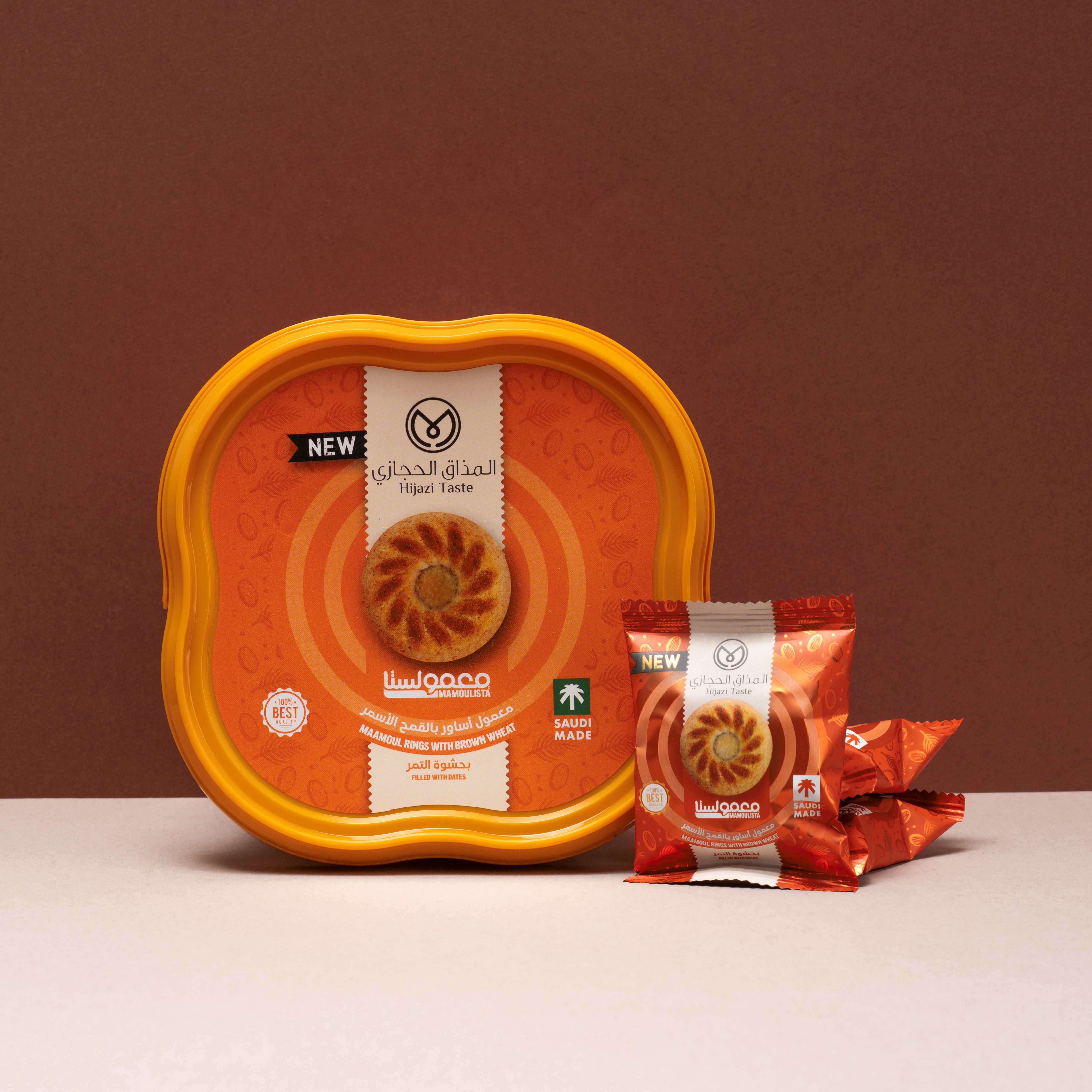 With Brown wheat flour stuffed with Saudi dates. Now comes to you in a modern and comfortable pack. Rings Mamoulista from Hijazi Taste for people with exquisite taste.